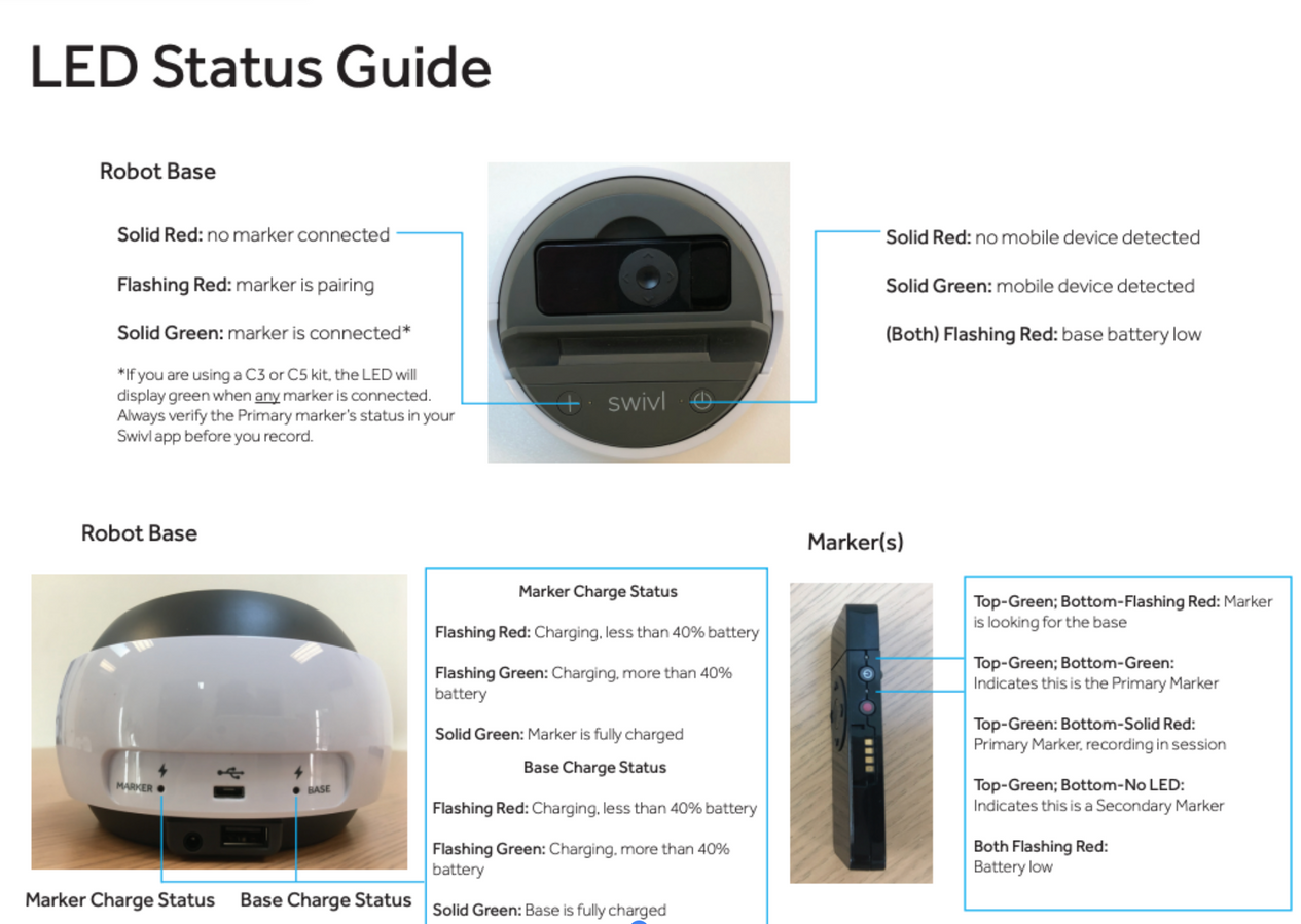 Green | The mobile device and at least one marker are successfully connected to the Robot base. | A mobile device is connected to the Robot base, but a Marker is not connected. |